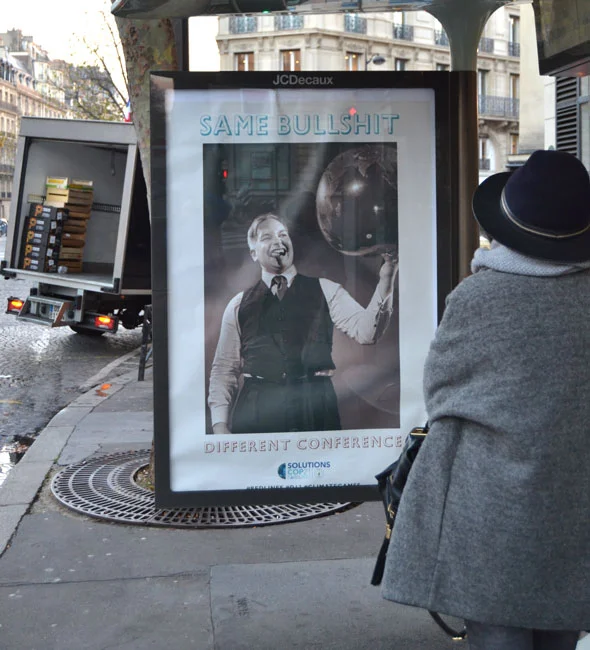 Cette spectaculaire opération a été réalisée en plein état d'urgence, avec l'aide de Parisiens impliqués dans le projet. Les affiches ont été placées dans des panneaux JC Decaux - une des plus grandes firmes de publicité pour les mobiliers urbains du monde, par ailleurs sponsor officiel de la COP 21. D'autres sponsors officiels de la COP 21, tels qu'Air France, GDF Suez (Engie) et Dow Chemicals sont parodiés dans diverses affiches – ainsi que des chefs d'état comme Francois Hollande, David Cameron, Barack Obama, Angela Merkel et Shinzo Abe. Les affiches, la plupart très belles, et à coup sûr objets de collection (résistez à la tentation, svp) ont été réalisées entre autres par Neta Harari, Jimmy Cauty, le collaborateur de Banksy Paul Insect, Escif et Kennard Phillips – la plupart d'entre eux ont collaboré cet été à l'exposition Dismaland de Banksy. On peut donc parler d'une conspiration des justes.