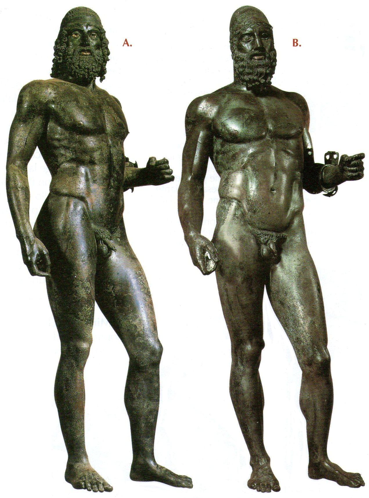 Riace Bronzes or the Riace Warriors, the pair of life size statues depict naked Greek warriors and were created between 460–420 BC.