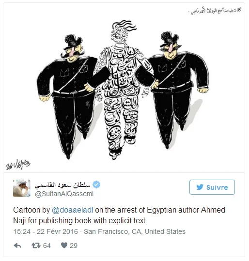 Comme Ismaïl Al Iskandarani, universitaire internationalement reconnu emprisonné depuis 85 jours sous le prétexte fallacieux d’appartenance aux Frères musulmans, la poétesse Fatima Naoot et le journaliste Islam Behery, récemment condamnés respectivement à trois et un an de prison pour « insultes à l’Islam », Ahmed Naji rejoint la cohorte des intellectuels victimes de l’offensive lancée par Abdel Fattah El Sissi contre les écrivains, chercheurs, journalistes, les laïcs et les libres penseurs à grand renforts de descente dans les maisons d’édition, de fermeture de galeries d’art, d’arrestations et d’interdictions de voyager.
