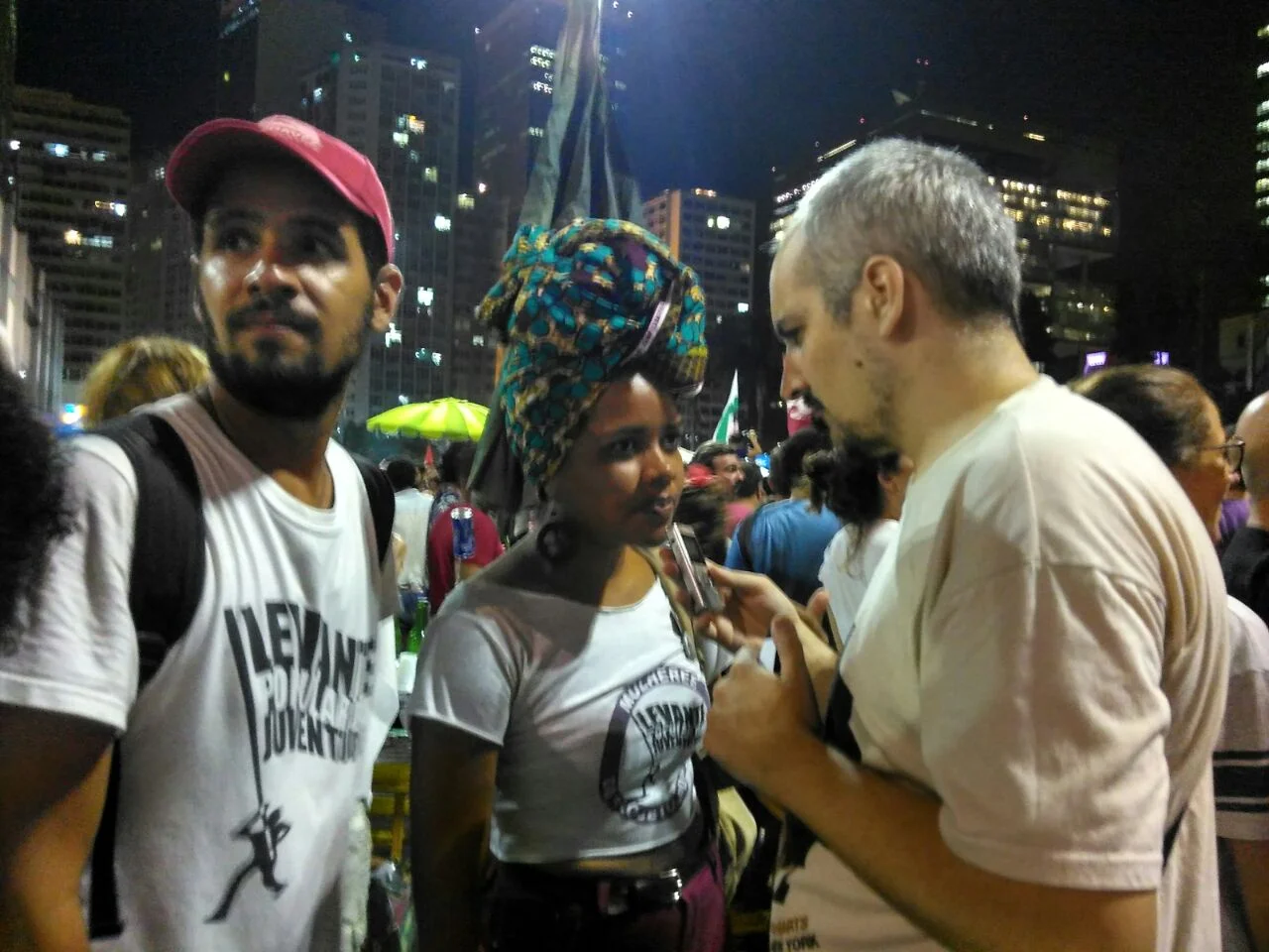 Les jeunes n’étaient pas les plus nombreux, mais les nouvelles générations étaient fortement représentées et leur voix plus bruyante se détachait du reste de la foule. Nous nous sommes entretenus avec Luma, du mouvement Levante Popular de Juventudes, qui représente les jeunes des périphéries, le Mouvement des Sans terre et les universitaires. « Nous, les jeunes, sommes dans la rue parce que nous croyons que le coup d’État est un coup de poignard contre les jeunes. Les jeunes des périphéries sont les principales victimes de la police, et celle-ci est financée par les grands hommes d’affaires qui financent également les partis politiques », décrivait de façon énergique la jeune activiste.