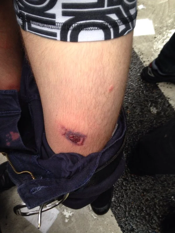 Plus tard, à Nation, nous avons pris en charge une personne dont une artère avait été sectionnée au niveau de la cheville, par un tir tendu de la police. Elle avait donc une hémorragie pulsatile, ce qui la rendait indéplaçable, pour pouvoir maintenir un point de compression. Nous sommes donc restéEs avec elle, à la soigner au centre de la place, pendant que les grenades lacrymogènes pleuvaient partout et que les tirs tendus sifflaient. Rapidement, d’autres blesséEs nous ont été amenéEs.
