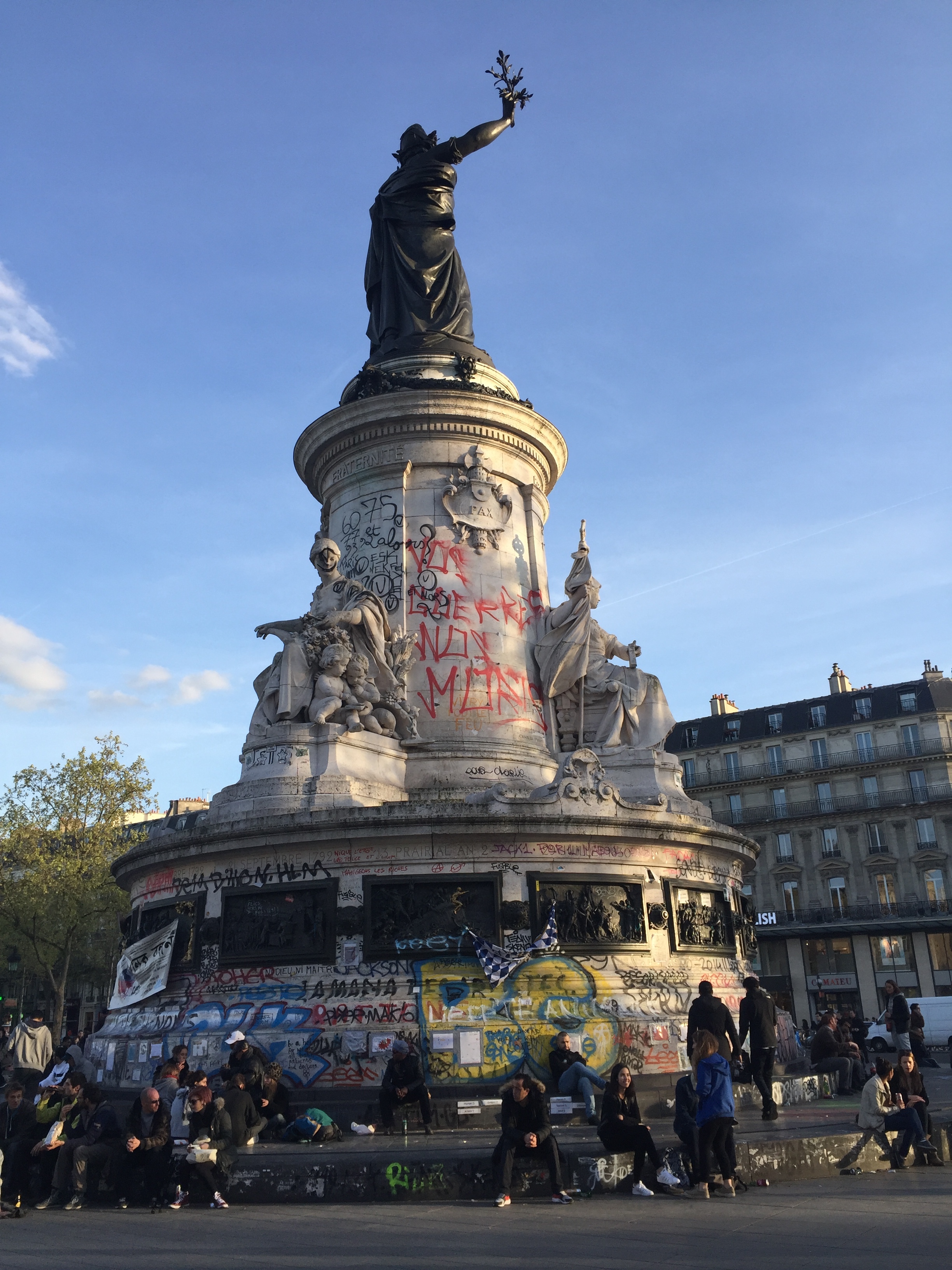La prise de la Place de la République, ces nuits-là qui duraient tout le jour, commençait par ce geste simple de se porter tout autour de la Statue et d’écrire sur elle l’amour et la haine, d’écrire une histoire qui serait la nôtre, dans la pensée de nos morts et la joie d’être ensemble ceux qui choisissaient la place qu’on occuperait dans nos vies.