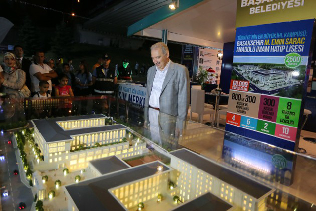 Maire de Başakşehir Mevlüt Uysal, devant les maquettes du Lycée imam hatip, Emin Saraç