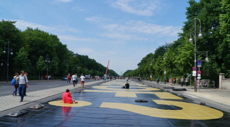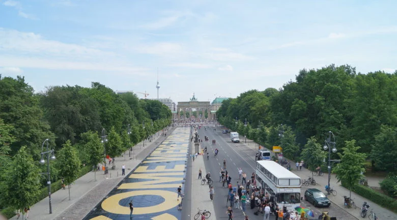 Le 29 mai, la question de 400 mètres de longueur a été déployée sur la rue du 17 juin, devant la Porte de Brandebourg, à Berlin. L’équipe suisse du revenu de base avait été invitée par l’« Omnibus pour la démocratie directe en Allemagne », qui se demande : « Pourquoi ne votons-nous pas, en Allemagne sur un revenu de base universel ? » La réponse est que le référendum national n’existe pas en Allemagne. Comme les Allemands ne peuvent pas se prononcer sur cette question, l’organisation demande l’instauration du référendum à l’échelon national. Cette demande sera présentée lundi, avec le plus grand nombre de signatures possible, au Parlement allemand (Bundestag).