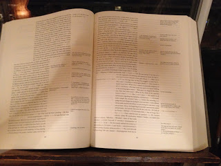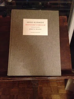 Le lecteur anglo-phone pourra, en attendant, se fier au génie de John E. Woods, qui vient de traduire en anglais Zettel's Traum pour les éditions Dalkey Archive, sous le titre Bottom's Dream. (Je n'ai pu évidemment résister et j'ai commandé la Bête, que j'ai reçue hier. Le livre est absolument superbe, tant par le soin apporté à sa fabrication (reliure toilé, taille monumentale rappelant les premières éditions à tirage limité des romans de Jean Genet, mise en page époustouflante…) Riche de 1496 pages, il pèse pas moins de cinq kilos six cent grammes. Format 27 cm x 35 cm. Epaisseur: 8,7 cm. Mon facteur avait du mal à croire qu'il s'agissait d'un livre…) Ah, petit détail: il comporte 1 325 000 mots. Et il a été tiré à 2000 exemplaires (avec une première mise en place de 1000 exemplaires).