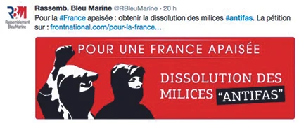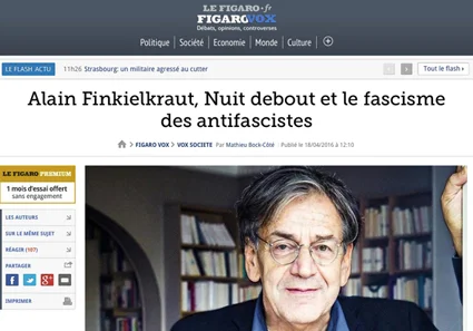 Si cette thèse conspirationniste ne suffit pas à dénigrer les antifascistes, l’extrême droite insistera alors sur leur « violence », en n’hésitant pas à les traiter de « fascistes » ou de « nazis », dans une inversion des rôles assez cocasse si elle ne trouvait un écho dans les médias et une partie de l’opinion. Comme pour la « liberté d’expression », la « violence » dont il est question est très sélective : pour prendre des exemples récents, une action aussi pacifique que celle de la Nuit Debout devant l’ESCP mardi 19 avril pour dénoncer la venue de Florian Philippot ou l’expulsion dans le calme de Finkielkraut sont considérées comme « d’une violence inouïe », mais les très nombreuses violences policières contre les manifestants, les attaques à coups de barre de fer de nervis d’extrême droite contre la Nuit Debout sont passées sous silence…