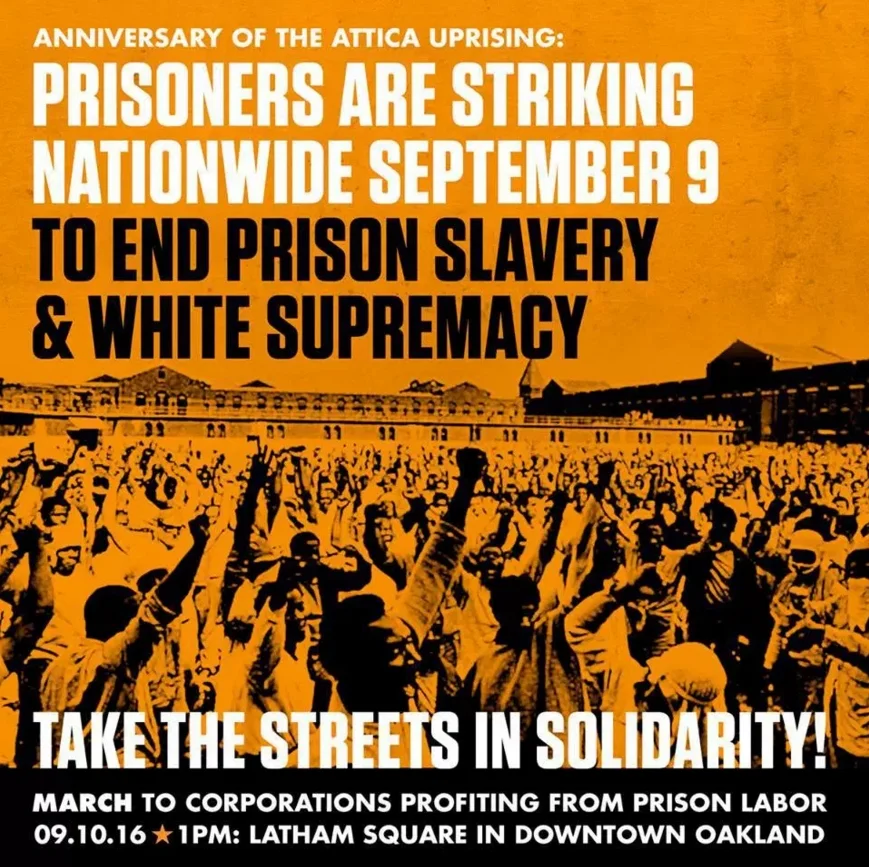 Alors que les arrêts de travail pourraient être considérés comme une arme anachronique du mouvement ouvrier, ils sont en fait plutôt novateurs dans le cas des personnes incarcérées, qui sont rarement considérés comme des travailleurs tout court, en dépit du fait que le fait que près de la moitié de la population carcérale des USA bosse pour une poignée de centimes, souvent pour des entreprises comme McDonald's, Victoria's secret et (jusqu'à récemment) Whole Foods. En Californie, près de cinquante pour cent des pompiers forestiers sont des détenus, ce qui permet à l'État d'économiser 1 milliard de $ par an. En même temps, les syndicats traditionnels, y compris l'AFSCME, le SEIU et le syndicat des Teamsters, représentent activement les intérêts des policiers et des gardiens de prisons à travers le pays. La grève du 9 septembre ne sera donc pas simplement une tentative d'améliorer les conditions de travail, mais une attaque contre le complexe industrialo-carcéral lui-même.