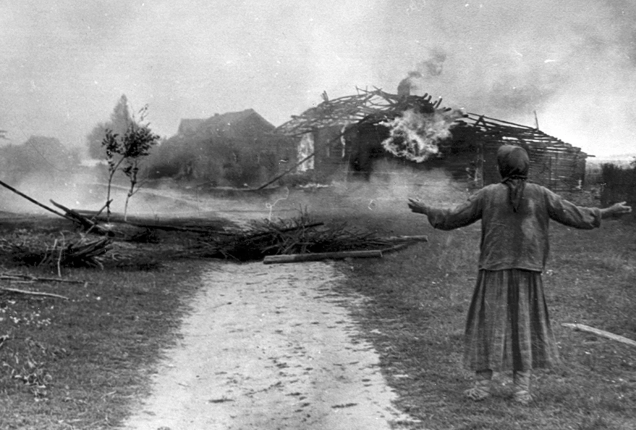 Des Allemands, un détachement punitif, sont entrés dans le village. Deux soldats allemands avaient été tués la veille sur la route. Le soir, on réunit les femmes du village et on leur ordonna de creuser une fosse à la lisière de la forêt… Plusieurs soldats s’installèrent dans l’isba d’une vieille femme. Son mari fut emmené par un politsaï au bureau, où on avait déjà rassemblé une vingtaine de paysans. Elle resta éveillée toute la nuit : les Allemands avaient trouvé dans la cave un panier d’œufs et un pot de miel, ils allumèrent eux-même le poêle, se firent frire une omelette et burent de la vodka. Puis, l’un d’entre eux, le plus âgé, joua de l’harmonica, les autres, tapant du pied, chantaient. Ils ne regardaient même pas la maîtresse de maison, comme si elle était un chat et non un être humain. Au lever du jour, ils vérifièrent leurs mitraillettes, l’un d’entre eux, le plus âgé, appuya par mégarde sur la détente et reçut une rafale dans le ventre. A ce moment-là, on les appela tous dehors. Ils ordonnèrent par signes de veiller sur le blessé. La femme voit qu’elle pourrait aisément l’étrangler : il bredouille des mots informes, ferme les yeux, pleure, claque des lèvres. Puis il ouvre soudain les yeux et demande d’une voie claire : « Mère, à boire. » « Maudit, dit la femme, je devrais t’étrangler. » Et elle lui donne à boire. Il la saisit par la main et lui montre qu’il veut s’asseoir, le sang l’empêche de respirer. Elle le soulève et lui se tient à son cou. À cet instant, on entendit la fusillade, la femme était secouée par des tremblements.