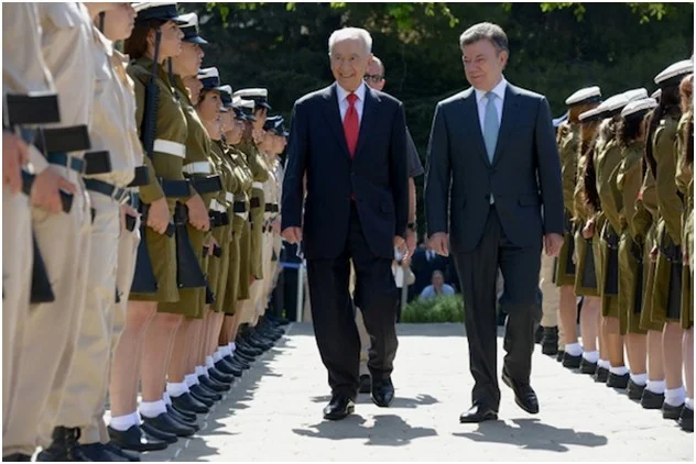 Juan Manuel Santos, en compagnie du président israélien Shimon Peres, criminel de guerre et Prix Nobel de la Paix, à Jérusalem, le 10 juin 2013. À cette occasion a été signé un traité de libre-échange entre les deux pays.