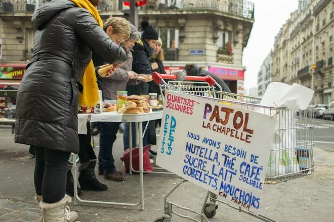 Notre association, avec bien d'autres, distribue chaque jours des petits déjeuners à des hommes, des femmes et parfois des enfants démunis de tout. Ces distributions sont menées en grande partie par des femmes justement, des infirmières, des retraitées, des étudiantes, des avocates, des chômeuses, des musiciennes, des professeures, des mères de familles, des lycéennes, des comptables, des psychologues. Certaines empruntent le métro la Chapelle, d’autres viennent à pieds ou en vélo. Et tous les matins nos chemins se croisent pour quelques heures rue Pajol, à deux pas de cette place « interdite ».