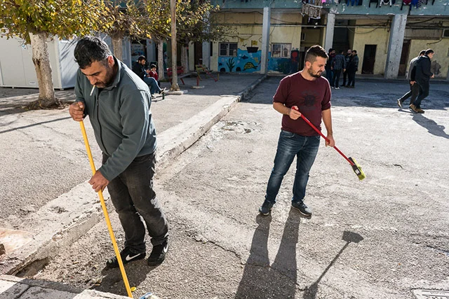 (Camp de Lavrio, Grèce) Le comité “propreté” organise les corvées de ménage dans le camp. Ayant tous les deux perdu leur père, l’un dans la guerilla, l’autre assassiné par Daesh, Ismail et Ahmed se sont rencontrés en 2015, quand Ismail est parti visiter ses frères et soeurs dans la guérilla. Ahmed avait été désigné our être son chauffeur. Les deux hommes se sont retrouvés dans le camp de Lavrio, et sont inséparables depuis.