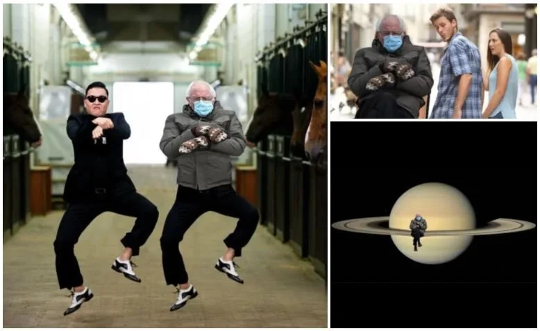 Sur le plan iconographique, la remédiation de la photo de Bernie Sanders appartient à la catégorie des mèmes de position, fleuron emblématique de ce jeu de recontextualisation participatif, où l’image d’une anomalie est détourée et insérée dans un contexte hétérogène. La démonstration de ce caractère hétérogène est assurée par la connaissance partagée de la référence culturelle, qui garantit le comique de l’insertion d’une source étrangère au contexte.