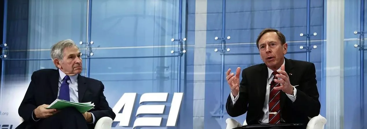 L'ancien directeur de la CIA et général d'armée à la retraite David Petraeus (R) participe à une discussion avec l'ancien secrétaire adjoint à la Défense des États-Unis Paul Wolfowitz (L) le 3 février 2017 à l'American Enterprise Institute for Public Policy Research (AEI) à Washington, DC.