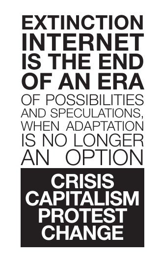 Extinction Internet n’est pas simplement un fantasme de technologie numérique de fin du monde qui sera un jour anéanti par une impulsion électromagnétique ou la coupure de câbles. Extinction Internet marque plutôt la fin d’une ère de possibilités et de spéculations, où l’adaptation n’est plus une option. Au cours de la décennie perdue d'Internet, nous avons réorganisé les transats du Titanic sous la direction inspirante de la classe de consultants. Que faire pour maintenir l’inévitable ? Nous avons besoin d’outils qui décolonisent, redistribuent la valeur, conspirent et organisent. Rejoignez l'exode de la plateforme. Il est temps de faire la grève de l'optimisation. Il y a de la beauté dans la panne.