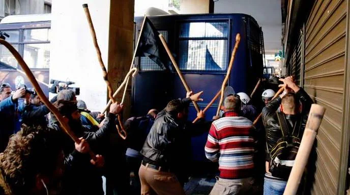 Le ministère a été transformé en véritable bunker et le ministre a eu tort de répondre avec mépris, refusant de recevoir les manifestants. Face au barrage des fourgons de la police anti-émeute, les manifestants se sont affrontés avec les MAT, équivalent de nos CRS. Certains ont tenté de contourné les fourgons provoquant des charges des policiers à coups de matraques et gaz lacrymogènes, les agriculteurs répondant à coups de « Katsouna », leurs bâtons de marche. D’autres agriculteurs de Macédoine et du Péloponnèse, apprenant le refus du ministère, ont pris leur voiture pour rejoindre les Crétois. Le quartier du Ministère est bouclé et la tension est vive.