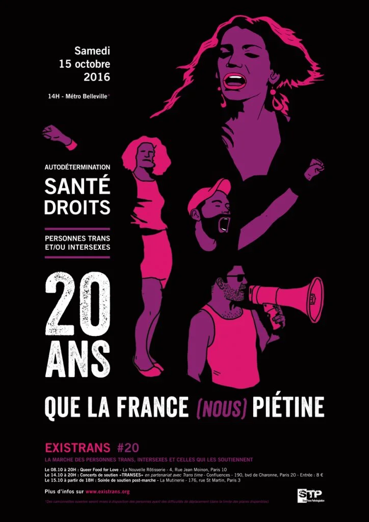 L’Existrans, la marche des personnes trans et intersexes et des personnes qui les soutiennent, partira le samedi 15 octobre 2016 à 14h de Belleville (Paris). C’est la 20ème édition de cette marche de visibilité et de revendications des personnes trans et intersexes ! 20 ans que nous marchons, pour notre santé, pour nos droits, 20 ans que la France (nous) piétine !