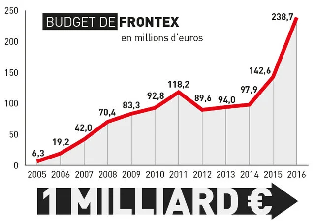 Cette agence possède des avions, des hélicoptères, des navires, des unités de radars, des détecteurs de vision nocturne mobiles, des outils aériens, des détecteurs de battement cardiaque... Frontex organise des vols de déportations, des opérations conjointes aux frontières terrestres, maritimes et aériennes |5|, la formation des gardes-frontières, le partage d’informations et de systèmes d’informations notamment via son système EUROSUR, qui a pour objectif la mise en commun de tous les systèmes de surveillance et de détections des pays membres de l’UE, etc. Son budget annuel n’a cessé d’augmenter jusqu’à ce jour : de 19 millions d’euros en 2006, il est passé à 238,7 millions en 2016 ! Les moyens militaires qui lui sont dévolus et son autonomie par rapport aux États membres ne cessent de croître.