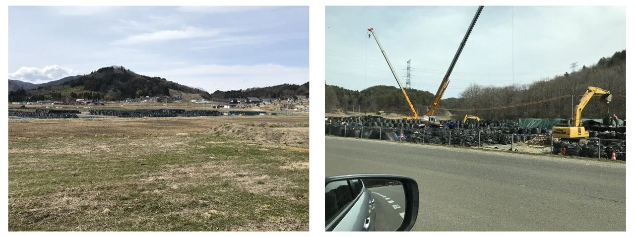 Paysage totalement creusé sur au moins un mètre de profondeur, typique de la région de Fukushima. On peut voir les sacs noirs remplis de terre contaminée au second plan et un cimetière et des maisons, pour la plupart abandonnées, à l’arrière plan. Ouvriers entassant les sacs. Aujourd’hui, le gros problème est de savoir où les stocker.