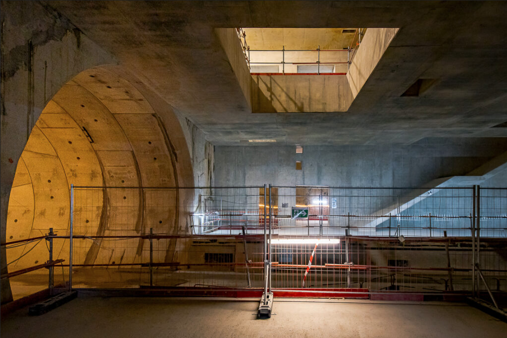 Ces photographies ont été réalisées au printemps 2022 ; depuis le chantier a progressé dans la continuité du projet architectural, conçu et dessiné par l’atelier King Kong, 4 architectes associés, Paul Marion, Jean Christophe Masnada, Frederic Neau, Laurent Portejoie sont à la conception du projet. “A mi-chemin de sa réalisation, l’atelier d’architecture King Kong et la galerie Archilib proposent une immersion au sein de cette infrastructure souterraine, véritable cathédrale de béton « inversée » baignée d’une lumière irréelle, de matières étonnantes et de jeux d’ombres magiques. “