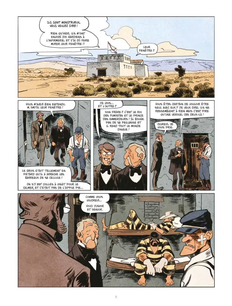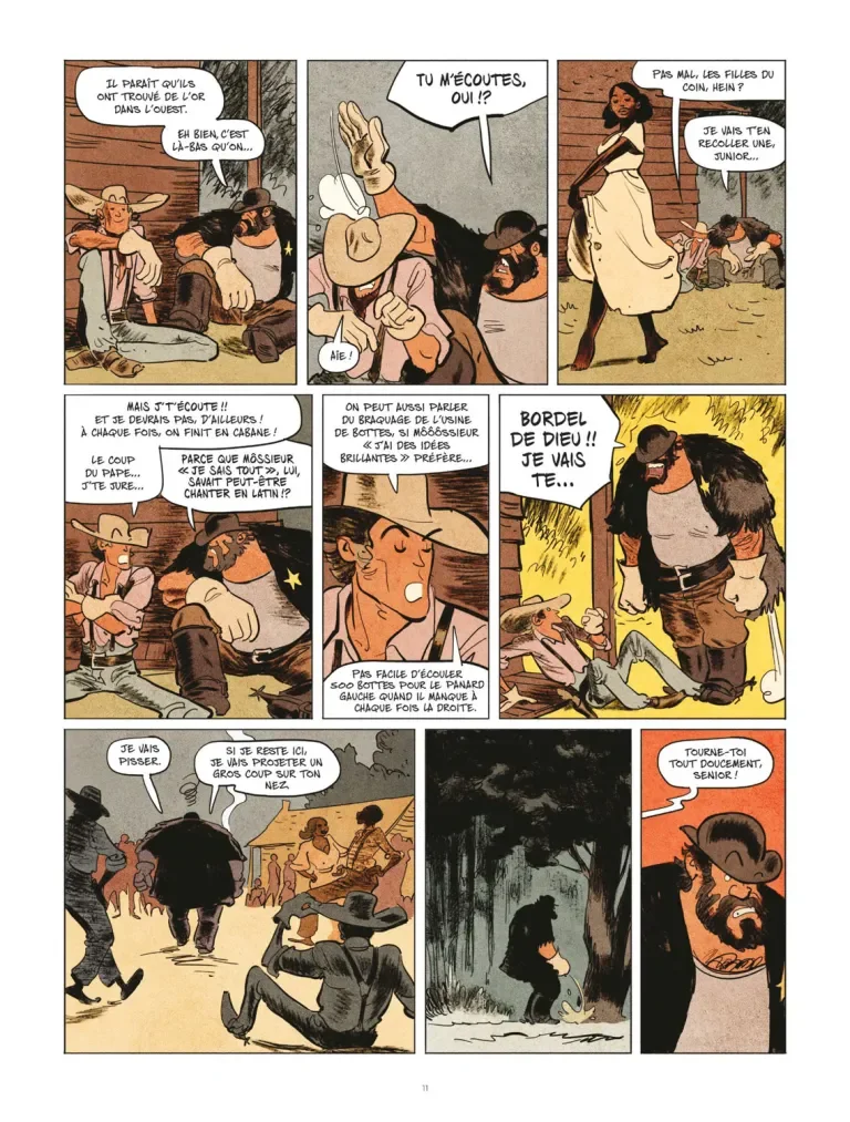 Avec la cavalerie qui leur colle aux basques quand ils sont en chariot ou au contraire avec du multi points de vue quand ils sont dans le saloon où il y a peu plusieurs actions en même temps. Il y a trois actions en même temps, ce qui est vraiment une tannée en BD. Et puis le grand final, un peu plus classique, avec la bagarre générale.