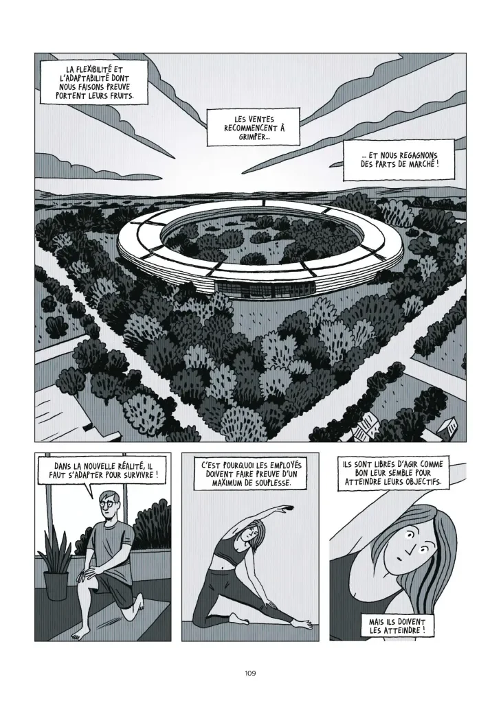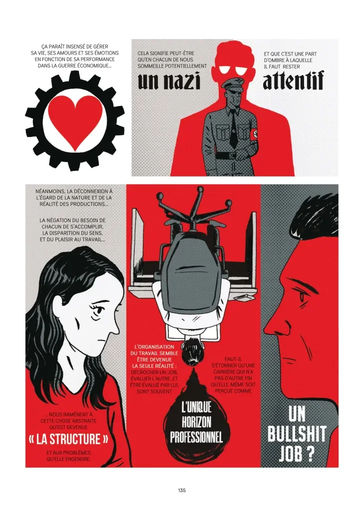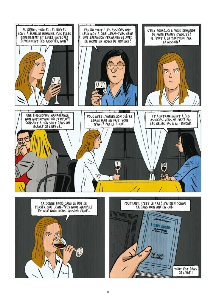 Pour moi, c’est la grande découverte de ce livre, je ne suis pas sûr que tous les essais universitaires ont cette étincelle de magie. La première stimulation est venue de là : je me suis dit que si j’arrive à reproduire ou à restituer cet élément dans la bande dessinée, ce serait vraiment pas mal. Et pour y arriver, il fallait que j’évoque l’expérience en entreprise que j’avais connue —et probablement similaire à celle des autres lecteurs.