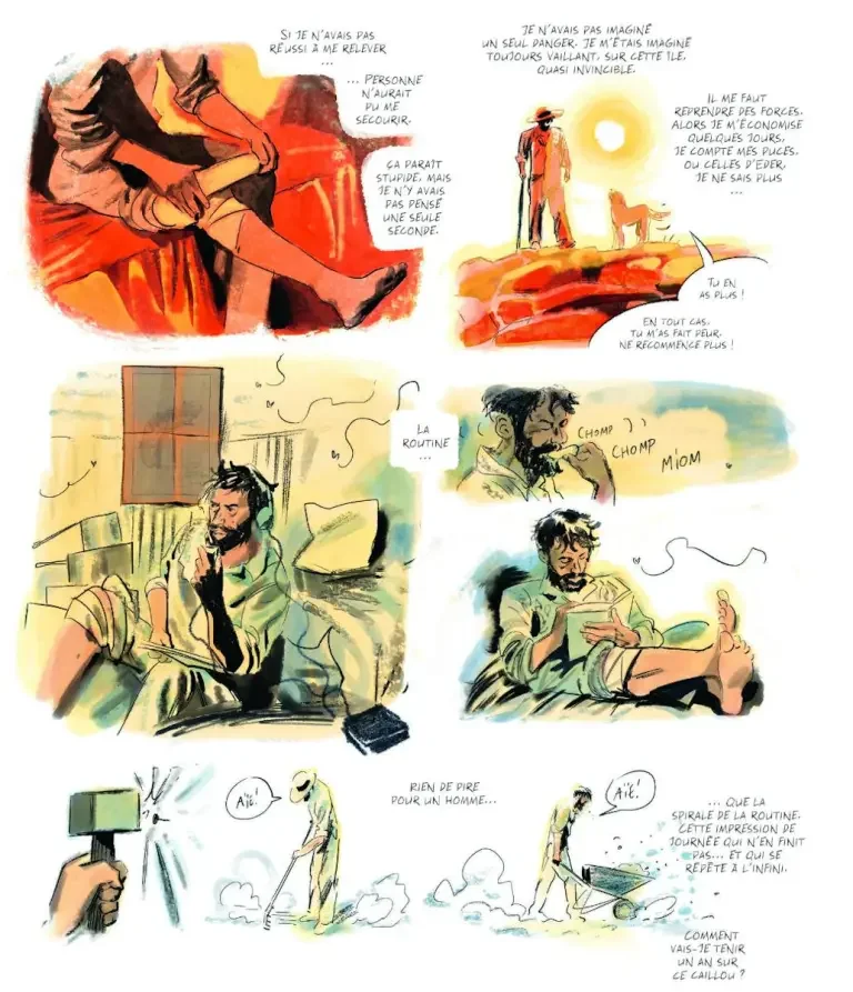 C’est ce qui donnait un peu de matière et de diversité au récit, parce que si vous restez au récit d’un homme qui est sur une île déserte, à simplement se préoccuper de savoir comment il va survivre et trouver de quoi boire vous avez vite fait le tour. Pour construire la dramaturgie, il fallait plusieurs personnages.