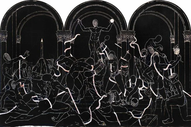 Assoukrou Aké, Les perfection-nés et le sacrifice de maturité, 2022, acrylique et crayon graphite sur contreplaqué gravé, 366 x 244 x 6 cm, Courtesy Ellipse Art project © l’artiste et Adagp — Paris, 2025 © Photo Théo Pitout