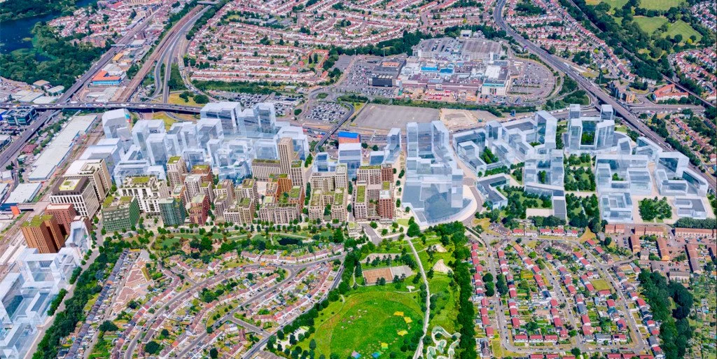 Visualisation aérienne de Brent Cross Town depuis le sud, montrant les constructions actuelles en couleur et les futurs blocs en transparence @Related Argent