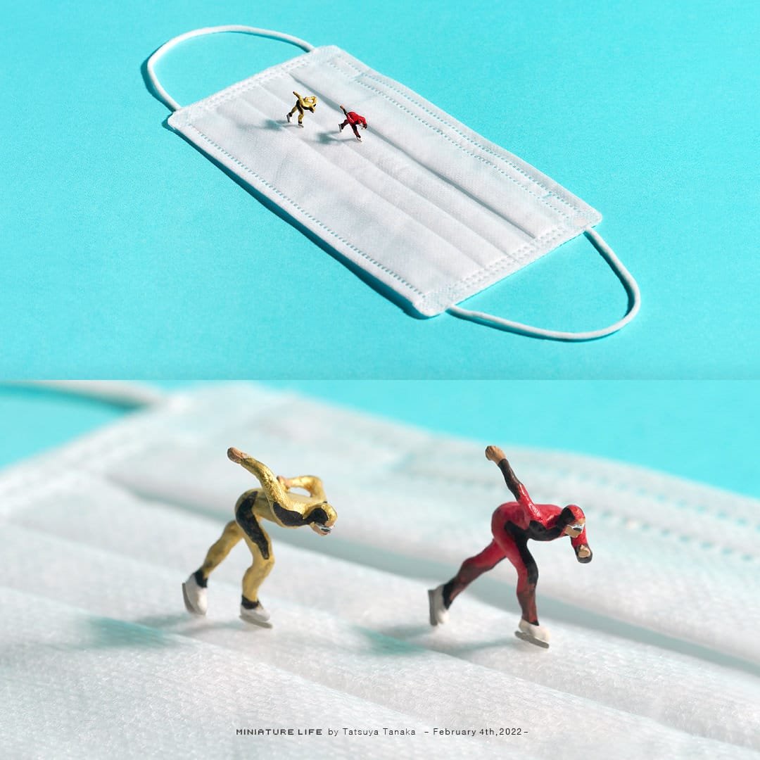 Au cours des dix dernières années, l'artiste japonais a réinventé des objets grandeur nature tels que des taille-crayons, des éponges et des pantoufles pour en faire de minuscules décors pour ses personnages : une touche « P » repose sur un chevalet de peintre, des bobsleighistes dévalent un bol sur un piment fort et des patineurs artistiques s'affrontent sur un masque chirurgical blanc.