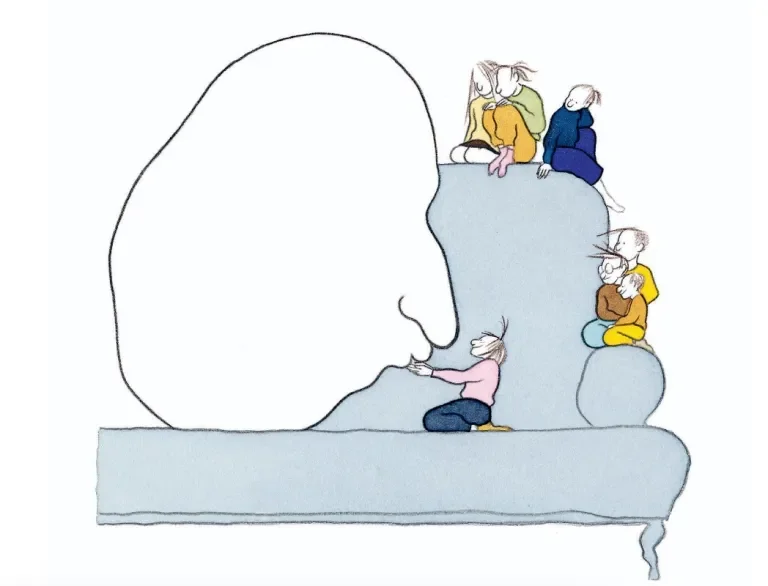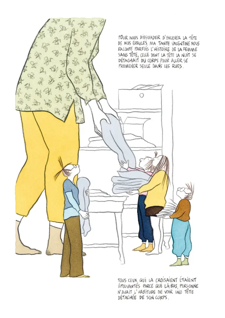 Si les plus jeunes s’en amusent et voient ces têtes qui déraillent comme des jeux et des occasions de rire illustrant au pied de la lettre les métaphores et les expressions ; de son côté, Martha les voit autrement. Entre la grand-mère qui perd seulement la tête, le poids des responsabilités, du silence, les corps abîmés… l’illustratrice joue sur la taille, les perspectives et les différences visuelles pour symboliser le passage à l’âge adulte et ce glissement du regard de Martha et de « la Grosse Tête » qui se rapproche d’elle. Des mécanismes d’emprise décrits à hauteur d’enfant à travers des images et des chemins détournés, jusqu’à l’abus sexuel où la jeune fille quitte le monde de l’enfance, ne voit plus les jeux ni le décalage.