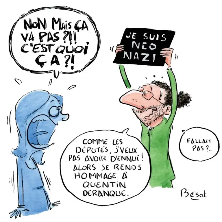 Le dessinateur explique dans un post être la cible de centaines d’insultes sous les posts où il publie ses dessins sur Facebook, et suite à «des dessins satiriques traitant de la récupération politique» autour de la mort de Quentin Deranque à Lyon.