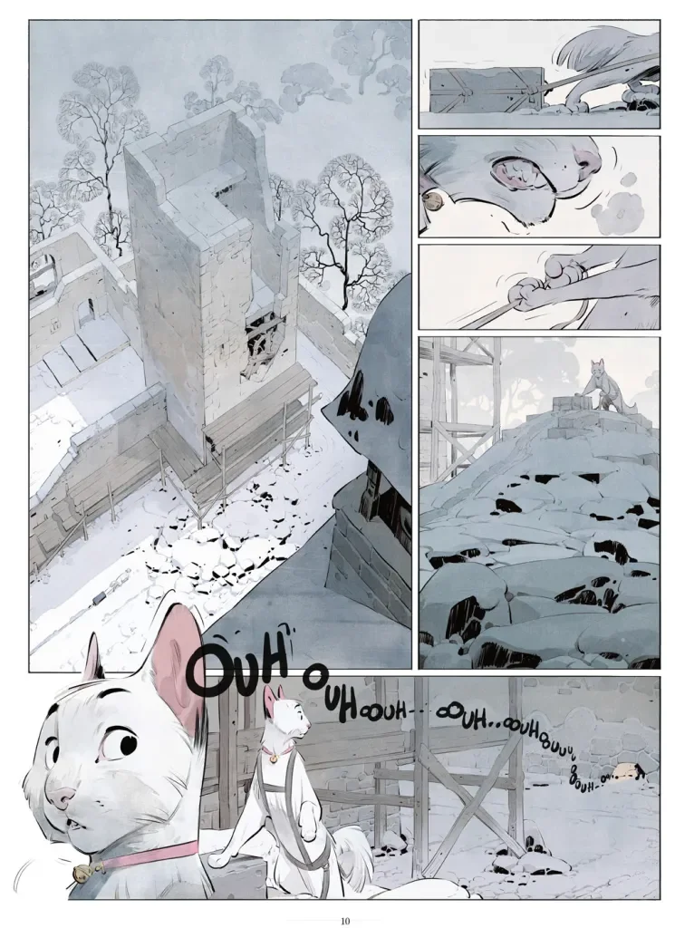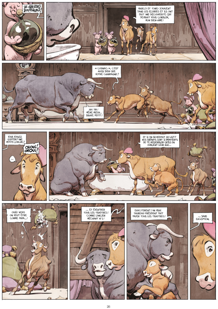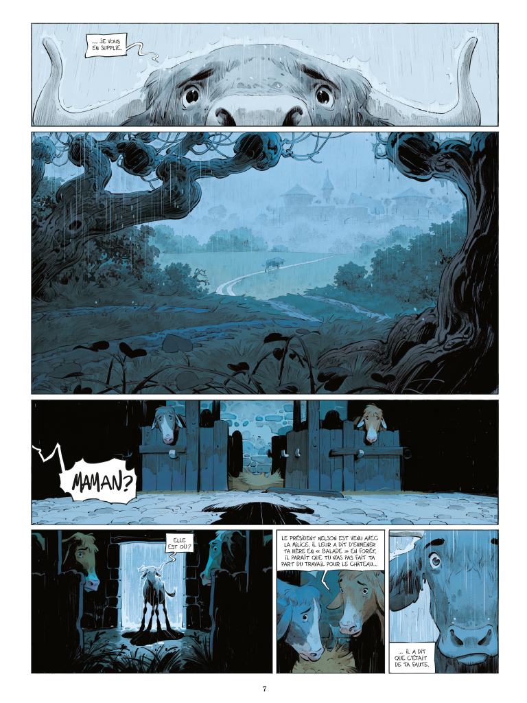 L’objectif de la couverture du T1, c’était de poser complètement le cadre de l’histoire, qu’il y ait écrit « Le Château des Animaux », qu’on voie le taureau imposant et sa milice qui dominent le petit chat, dans un château. L’image raconte très clairement toutes les bases de l’histoire et le rapport de force.