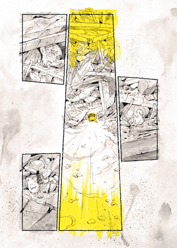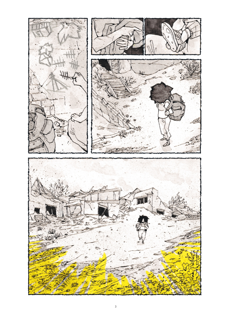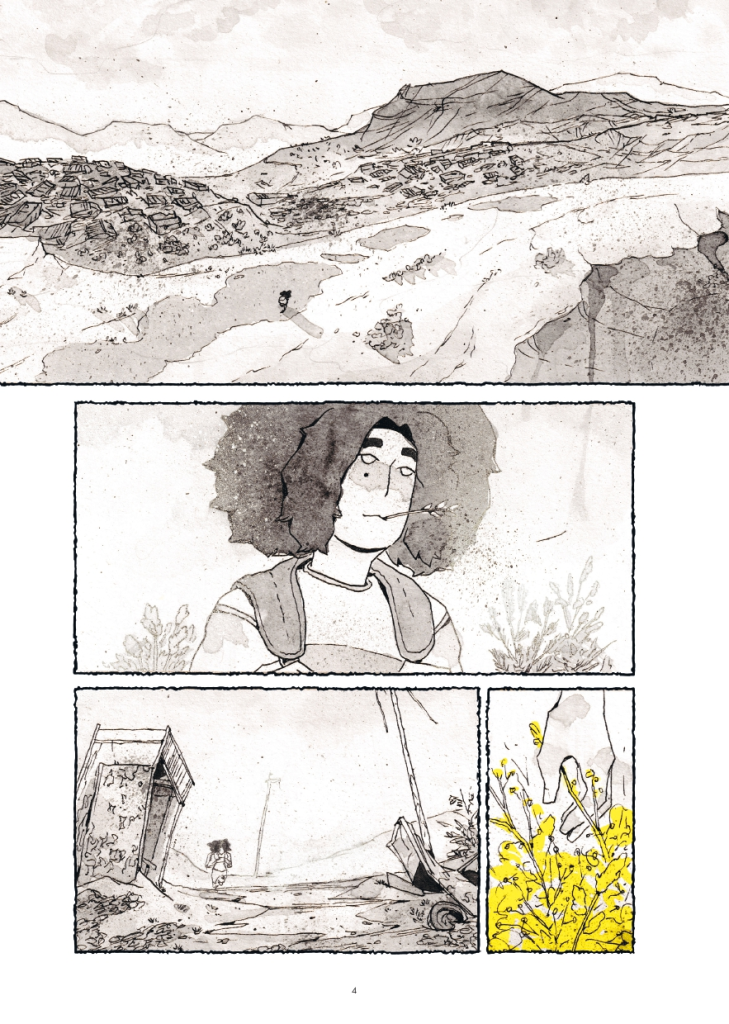 En résulte une post-apo joyeuse qui tire vers le hopepunk, en totale opposition avec La Route de Cormac McCarthy, best-seller du genre où l’auteur américain décrit un futur où l’humanité offre bien peu d’espoir [lisez notre article complet sur le sujet ici]. Asphalte sauvage cherche plutôt la lumière malgré les difficultés de ce monde ravagé, porté par une bichromie jaune et grise stylisée pour rendre cet univers. Avec des planches dessinées à l’encre, avec des effets délavés, griffés ou éclaboussures, coulures et projections, la dessinatrice propose son travail le plus audacieux graphiquement. Les rehauts de jaunes viennent souligner des émotions, isoler des instants ou mettre en valeur des propositions graphiques qui participent à nous immerger dans cet univers.