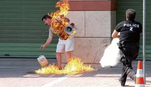 Sur les parvis des maisons de l’emploi pour tous c’est chaque jour de chaque semaine qu’on tente les immolations. On entre en immolation après qu’on est entré en pauvreté avec élan de poursuivre jusqu’aux enfers la pauvreté. On va vous les enlever les 600 euros pour l’entourloupe d’avoir reçu les allocations chômage alors que vous travailliez, 600 euros que vous n’avez pas déclarés, ce non-variable-là (n’avez pas déclarés) s’appelle fraude aux Assedics et nous poursuivons fraude aux Assedics. En face, petit sourire (paie pas de mine). On se retire de la maison de l’emploi pour tous, s’organise, premier mail, deuxième mail, troisième mail, je prendrai feu ferai feu ferai le feu. Les milices anti-incendiaires sont composées de privés sans emploi qui à la maison de l’emploi pour tous revêtent le costume et tentent de repérer les malheureux qui. On inonde les parvis. Ça miroite un moment, c’est assez beau sous les lumières de mars. C’est un boulot tranquille, en fait.