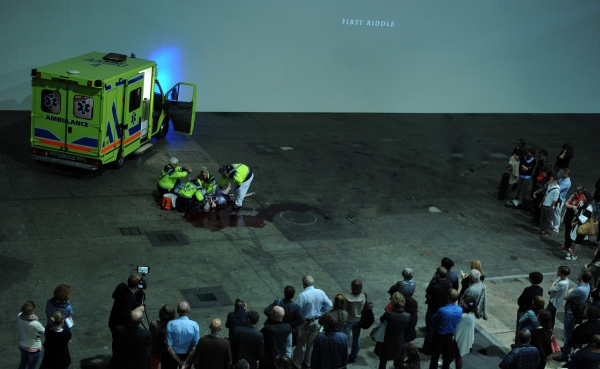 "Le Metope del Partenone a été créé en juin 2015 à Bâle, dans le cadre de la foire d’art contemporain d’Art Basel. La forme du spectacle auquel vous allez assister est en tous points identique à celle de Bâle. Rien n’a changé. Ni les actions, ni le temps, ni le mode dramatique.