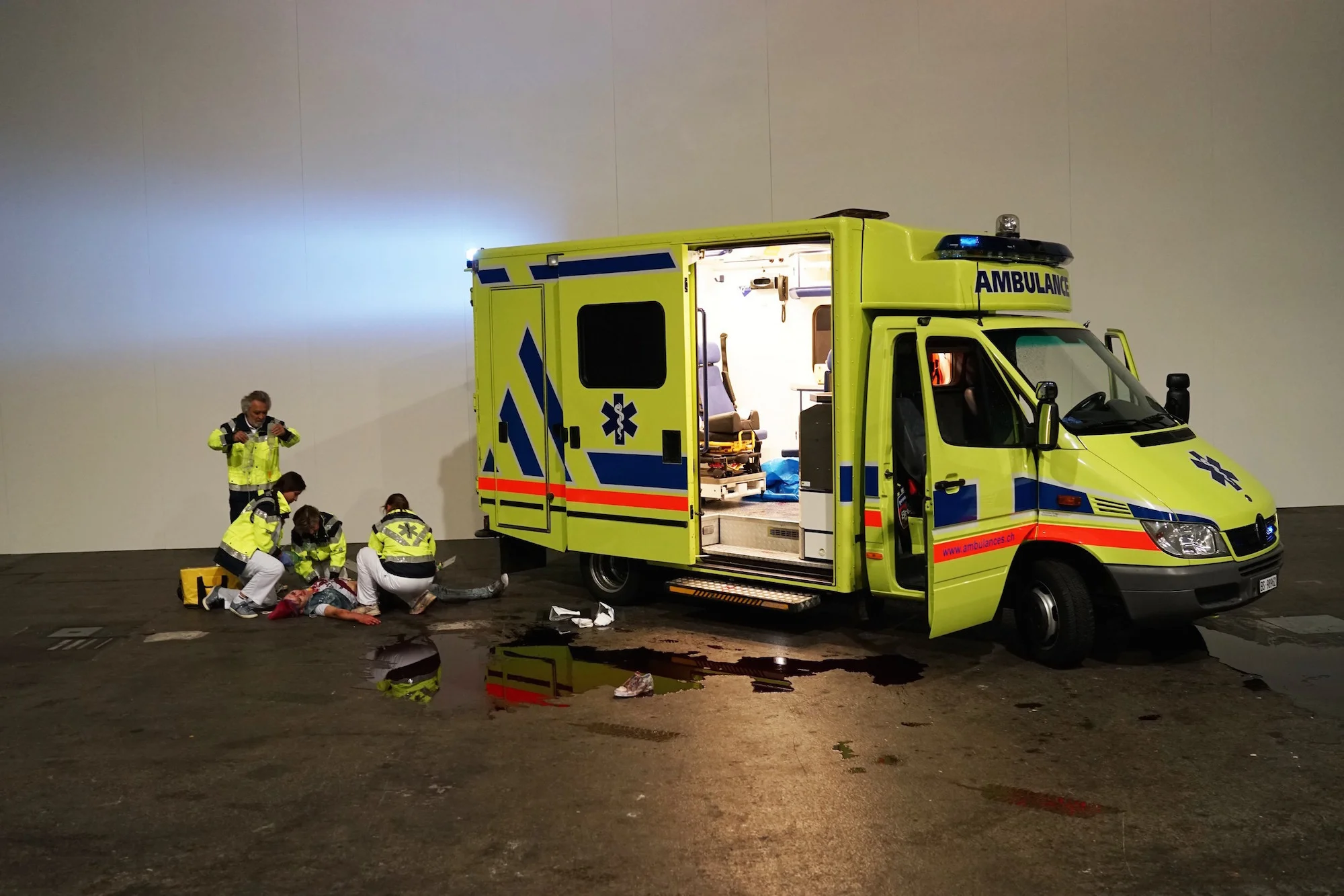 Comme là-bas, ici aussi, l’espace n’a pas de tribune. Idéalement, c’est comme être dans la rue : on est debout, on marche, on forme des cercles spontanés autour des actions. On voit des corps tomber, on lit des énigmes projetées sur le mur.