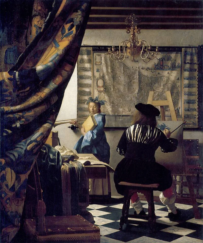 L’Art de la peinture selon Vermeer serait donc riche d’un quadruple enseignement. Méditation sur l’inachevé, l’infini, le décentrement, le discontinu, ce serait l’art d’une époque inquiète. La Terre explorée et cartographiée s’avère alors un archipel, une Terre-archipel et cette Terre qui tourne peut-être autour du soleil, ne serait plus le centre de l’Univers. Époque post-copernicienne et post-galiléenne, époque de Descartes et de Pascal, époque de Kepler, de Newton et de Spinoza, époque où tous les savants s’interrogent sur les lois de réfraction de la lumière, sur les aberrations de la lumière, comme on disait alors. Or la question de la réfraction de la lumière – question qui fascinait sans doute Vermeer et qui fascine en retour celui qui regarde aujourd’hui ses tableaux -, cette question est inextricablement liée dès l’origine à la question de la triangulation, à la détermination des longitudes, à la recherche d’un point fixe, insituable, où le temps serait aboli.