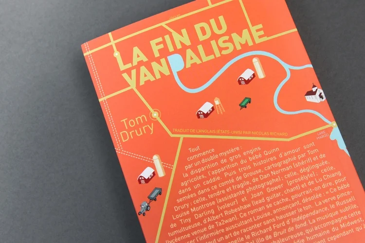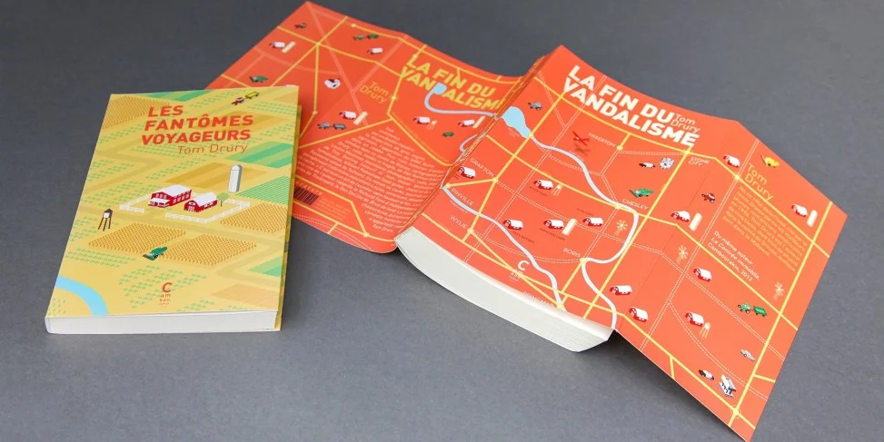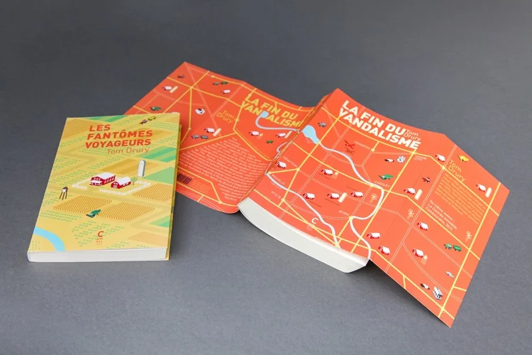 Le premier livre de Tom Drury, « La fin du vandalisme », est une sorte de roman choral dont tous les personnages habitent un même lieu, le comté de grouse. L’auteur a lui-même dessiné une carte de cet endroit et l’idée m’a semblé vraiment intéressante. Cela permettait aussi d’exploiter au passage tout le déroulé de la couverture. Dans le second roman, « Les fantômes voyageurs », l’histoire se resserre sur des personnages qui occupaient une place secondaire dans le précédent opus. J’ai donc décidé, pour rester sur la ligne établie pour La fin du vandalisme, de garder la même atmosphère et de simplement « zoomer » dans la carte pour se concentrer sur un lieu plus spécifique.