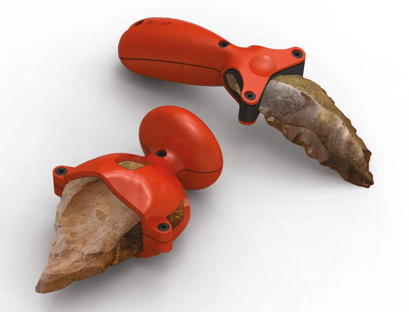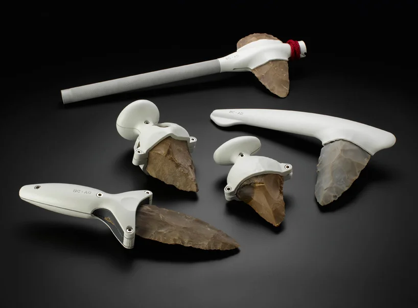 Très intéressant ! et beau ! et - disons-le franchement - très certainement amusant comme expérience à table ou à la maison, devant un meuble Ikea à monter, ou des petits travaux à faire. Les deux designers israéliens Ami Drach et Dov Ganchrow, qui avaient déjà étonné avec une très belle collection de lampes totémiques faites à partir de phares de voiture (Parkenlicht), ont eu l'idée d'un saut direct du post-modernisme au pré-historisme en adaptant des outils de l'âge de pierre au monde d'aujourd'hui : c'est le BC/AD Project (ou Projet avant Jésus Christ).