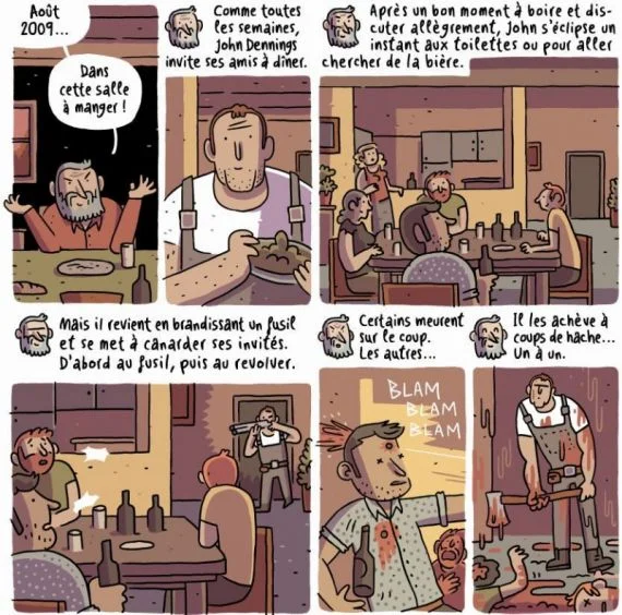 Comment un auteur en manque de sujet se rapproche d'un cinglé revendeur de trophées macabres pour y trouver la substance de son prochain ouvrage. Un roman graphique catalogue de perversions, de tueurs en série et d'humour noir à tous les étages.