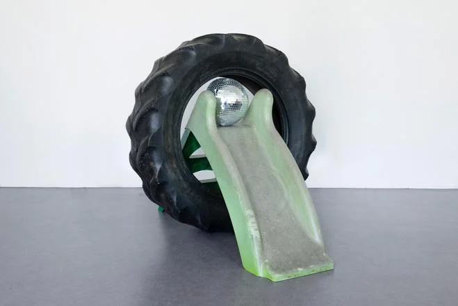 Pierre Ardouvin, Aube de l’Odyssée, 2015 Pneu de tracteur, tobogan, boule à facettes Courtesy of the artist & Galerie Praz-Delavallade, Paris.