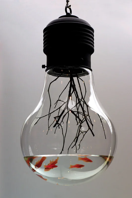 MyeongBeom Kim, Edison, 2004 Ampoule, poissons, eau, technique mixte — 38 × 38 × 76 cm — Pièce unique