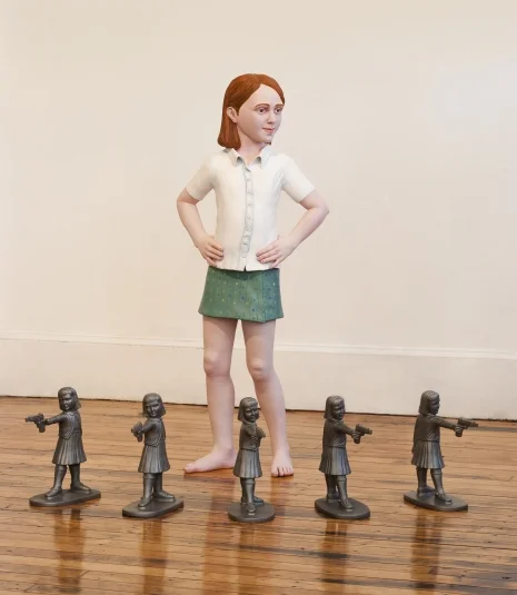 Elle en a déduit qu'au lieu d'incorporer corps ou têtes de prédateurs qu'on associe généralement au masculin, elle allait plutôt sculpter une tête de loup féroce qu'elle installerait sur un corps de petite fille habillée en rose. Le déclic s'est produit là et depuis, elle a ouvert un champs à la sculpture en lui redonnant d'autres buts.