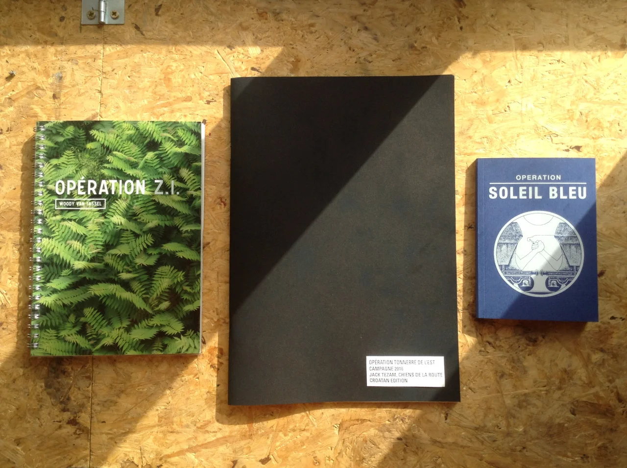 OPÉRATION ZONE INSULAIRE : Woody Van Tassel Format A5, 44 pages, spirales, Fr / En, impression numérique couleur, sur-couverture en PVC sérigraphiée, imprimé en France, 100 exemplaires.