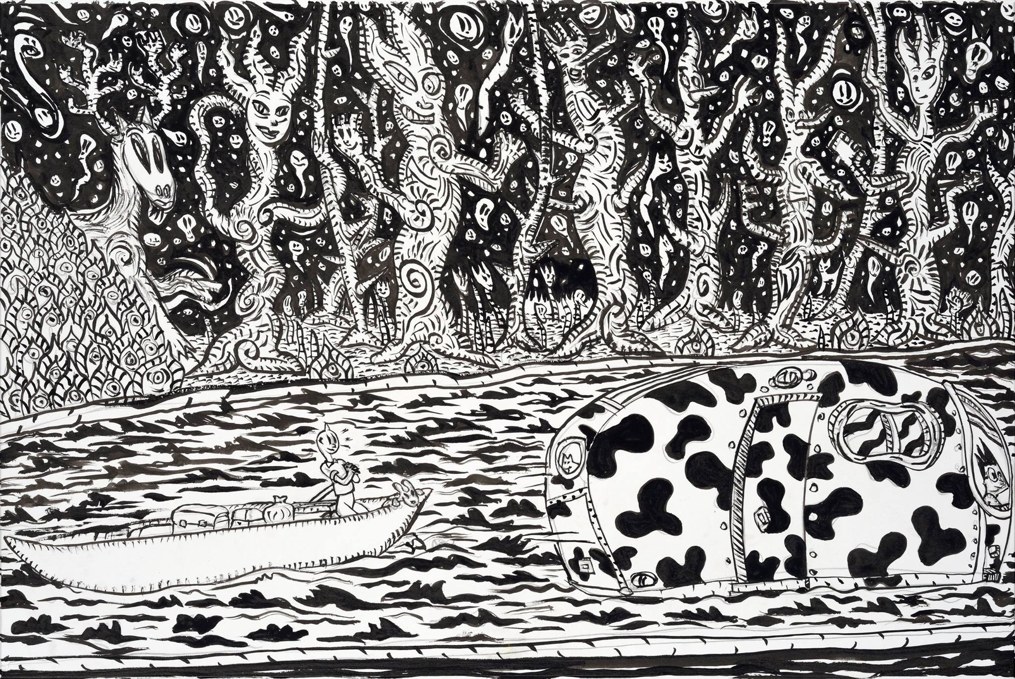 De son expo précédente sur Jung, Pacôme Thiellement disait ceci : Olivia Clavel a trouvé le trait qui réconcilie les univers. Pleine de couleurs fluorescentes, explosives comme des feux grégeois, elle creuse pour relier les mondes et solidifie canaux et tunnels. Personne n’a jamais aussi magnifiquement tracé le passage de la nuit depuis Van Gogh. Olivia était une télé, un récepteur : alpha et oméga du Livre Sacré du Punk, sa bande dessinée était comme le son d’une guitare électrique, une transmission de l’électricité du monde. Mais la télévision s’est faite chamanique : elle a commencé à recevoir les lucioles et les esprits des autres mondes et ce sont eux et elles qui éblouissent nos cœurs. Le monde des formes en suspens est un jardin. Les âmes se mêlent aux animaux et aux arbres. Et dans nos larmes et nos rêves nous voyons le chemin des univers successifs se dessiner face à nous. »