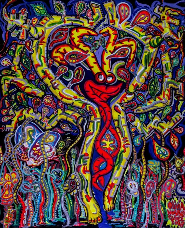 Plus de quarante ans se sont écoulés depuis, tandis que les peintures d’Olivia Clavel nous emmènent dans la multiplicité des mondes ; elles ouvrent toutes grandes les portes de l’esprit. C’est la nuit que les pigeons voyageurs s’entraînent. Flamboyants, ils s’élèvent entre les troncs des arbres bleus qui s’embrassent, copulent en une érotique et ésotérique célébration. Les disparus — Claude le père d’Olivia, sa mère — apparaissent au détour de ces forêts vivantes où se rejoint la création dans son ensemble, pour un éternel recommencement. Cerfs, chats, chouettes, scarabées, pics, oiseaux de feu… Plus besoin de drogues : dans la forêt que survolent des vaisseaux spatiaux extraterrestres et d’où surgissent les rêves — ces pigeons voyageurs se faufilant parmi les branches —, les ampoules électriques qui poussent aux extrémités des feuilles multicolores demeurent perpétuellement allumées dans le cerveau de l’artiste, éclairant ses toiles comme elles éclairent l’essor des rêves ailés.