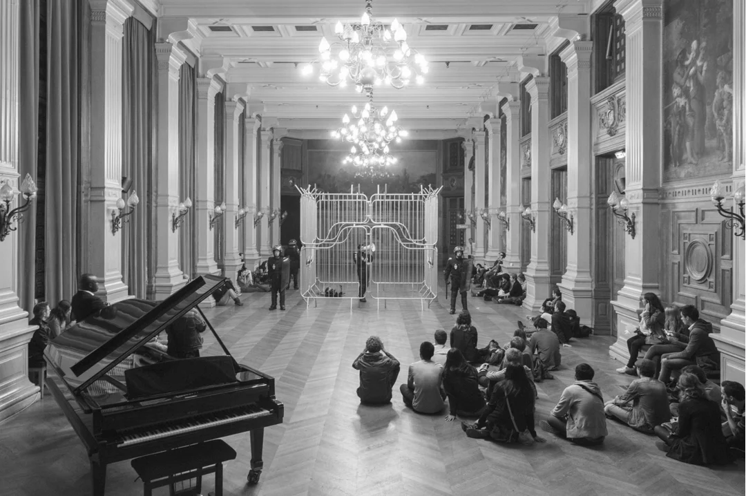 Didier Fiuza Faustino : (né en 1968) aborde les rapports complexes entre le corps humain et l’habitat qui l’entoure, de manière « construite ». Créateurs d’œuvres plastiques mais aussi d’architectures, Didier Fiuza Faustino œuvre à la frontière entre ces deux disciplines et renouvèle à chaque projet une expérience corporelle de l’espace. A La Maréchalerie il présente une installation composée de barrières Vauban utilisées habituellement par les forces de l’ordre pour canaliser les foules qu’il transforme en une sculpture invitant à repenser l’ordre imposé. Retravaillées selon des formes classiques, les barrières acquièrent une dimension esthétique inspirée des jardins à la française et formalisent la relation entre architecture militaire et jardin.