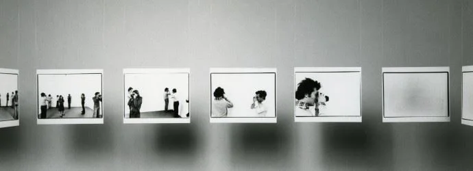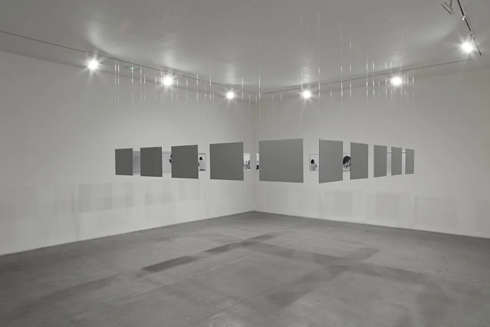 Dans l’antichambre de la salle de destruction massive, où des éclats sont désormais éparpillés au sol, on peut voir des pièces plus anciennes, notamment des photographies. L’installation Raggi di Persone (1975) à l’entrée de l’exposition dispose des clichés suspendus en forme de pièce virtuelle fermée sur elle-même. Sur les images, des anonymes, un appareil devant le visage, photographient le rien, dans une pièce blanche.