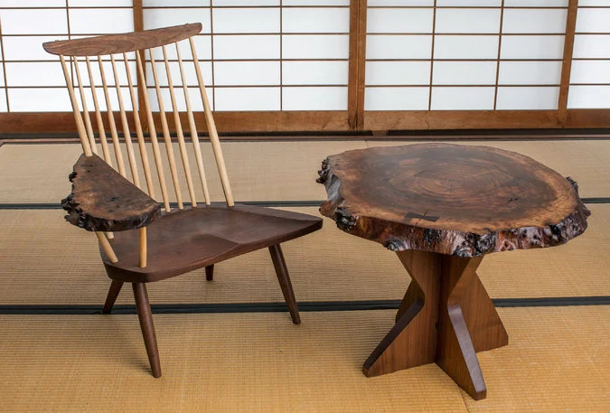 Avant de commencer à travailler vraiment le bois, George Nakashima fut architecte et ne se mit à l'ébénisterie japonaise qu'enfermé dans un camps, comme ses congénères nippo-américains durant la Seconde Guerre mondiale. Il y est vite devenu une célébrité et en fut sorti pour devenir le principal rénovateur du travail du bois en Pennsylvanie, puis le principal ébéniste des USA. Avant de recevoir le prix, au Japon, de dieu vivant de l'ébénisterie…