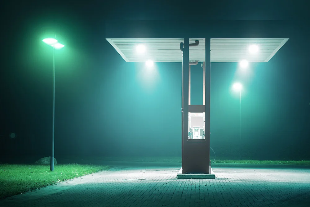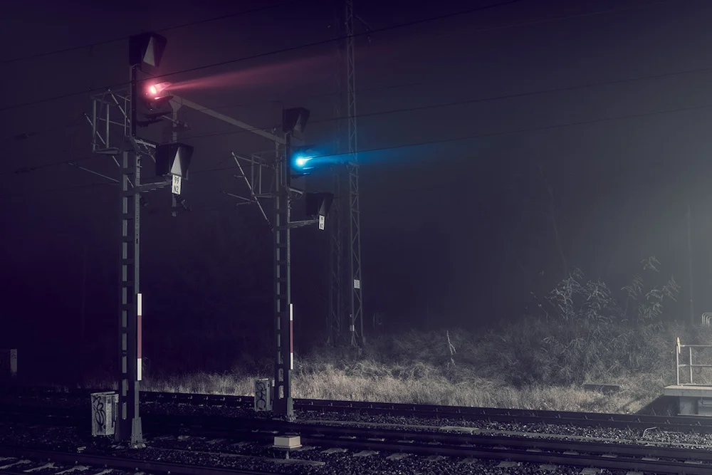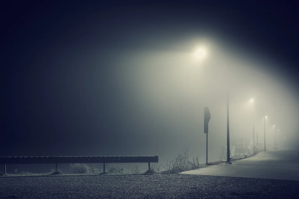 Au cours de ses promenades nocturnes, il flashe des paysages désincarnés, captant l'atmosphère des rues, des gares et des stations services jusqu'aux petites heures du jour. Chaque cliché est composé de brumes et d'éclairages artificiels, comme en absence.